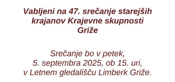 Srečanje bo v Letnem gledališču Limberk Griže, v soboto, 5. septembra, ob 15. uri. Prijave sprejemajo do 2. septembra: Albina (041 441 425), Mira (031 726 875), Ivica (051 319 623) in ...