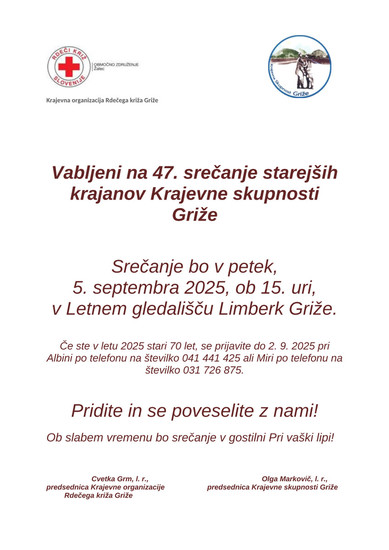 Na srečanje starejših v Limberk ste vabljeni tudi krajani, rojeni leta 1955, ki niste prejeli pisnih vabil. Na srečanje se prijavite do 2. septembra na telefonski številki 041 441 425 pri Albini.